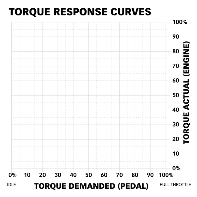 Fahren Sie zunächst auf die Autobahn und wählen Sie eine von 30 Master-Drehmoment-Reaktionskurven, um die gewünschte Durchzugskraft im mittleren Drehzahlbereich zu ermitteln. Kehren Sie dann in den Stop-and-Go-Verkehr zurück und überprüfen Sie den Start aus dem Stand. Die Reifen drehen durch? Verringern Sie die Leistung mit einer der 5 Starttrimmstufen.