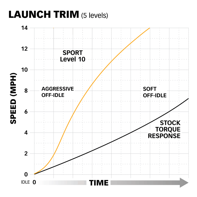 Wenn Sie eine aggressive Master-Drehmomentkennlinie für maximale Durchzugskraft im mittleren Drehzahlbereich gewählt haben, diese aber bei niedrigen Geschwindigkeiten als zu aggressiv empfinden, können Sie aus 5 Stufen der Launch Trim wählen, um die Drehmomentabgabe unter 10 mph zu drosseln.